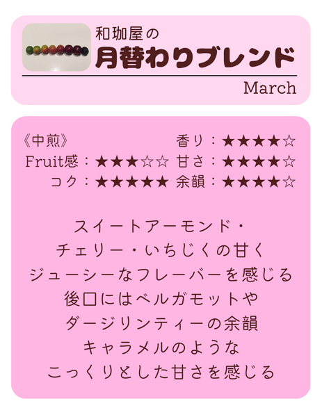 和珈屋オリジナルのその月の旬の産地買付け豆だけを贅沢にブレンドすることで